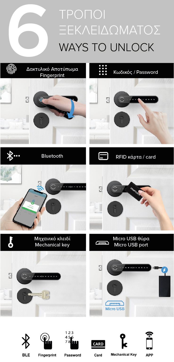 • Έξυπνη πρόσβαση APP/ WIFI / BLE / δακτυλικό αποτύπωμα / pincode