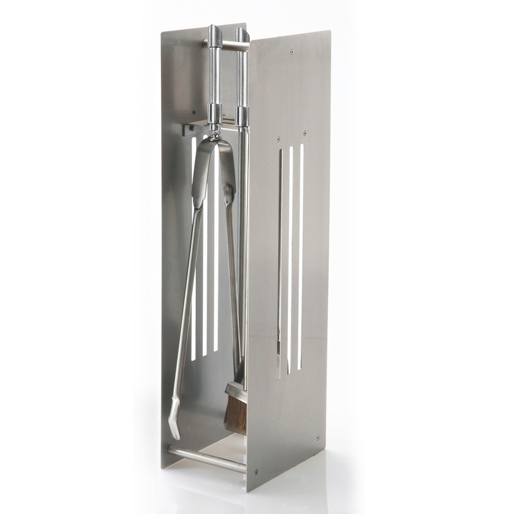 Ανοξείδωτη βάση μαζί με 4 εργαλεία τζακιού που διαθέτουν ξύλινο χερούλι, οι διαστάσεις του σετ είναι: 25cm x 16cm και ύψος 65cm